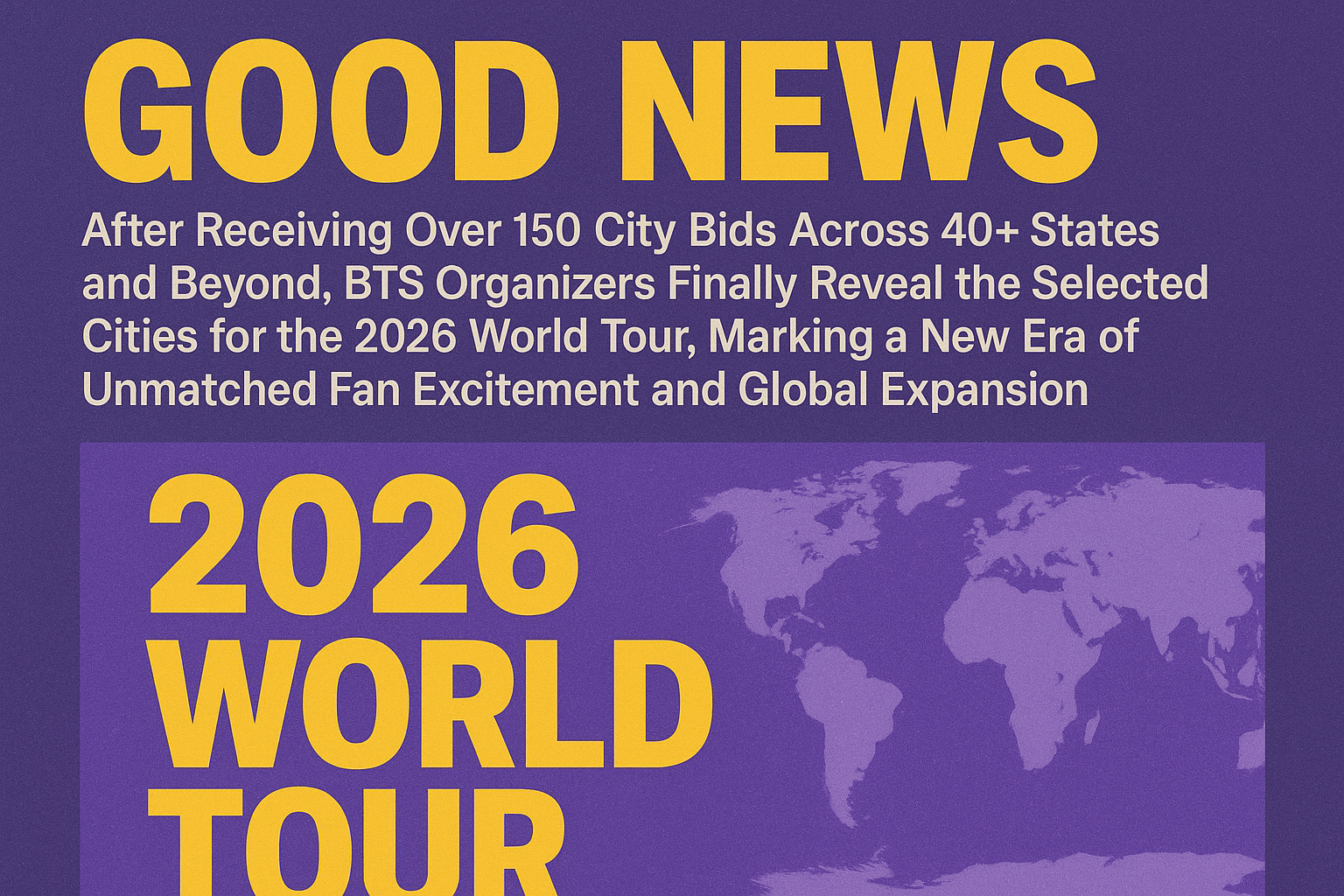 Here’s the news in normal alphabet: GOOD NEWS After Receiving Over 150 City Bids Across 40+ States and Beyond, BTS Organizers Finally Reveal the Selected